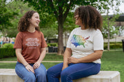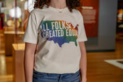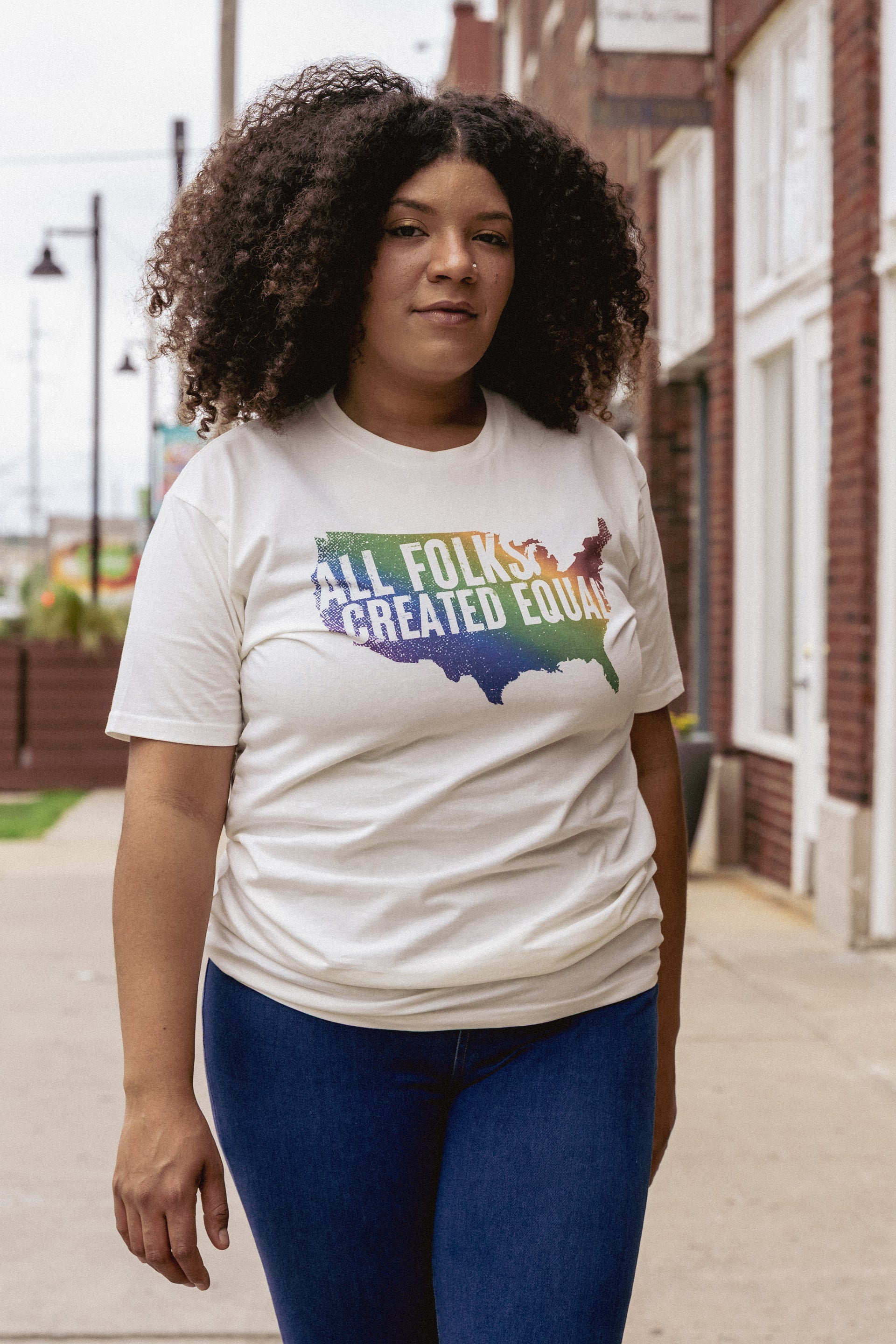 At the Woody Guthrie Center, we believe that all folks are created equal! This cotton shirt features our All Folks USA design in a rainbow split direct-to-garment print.
