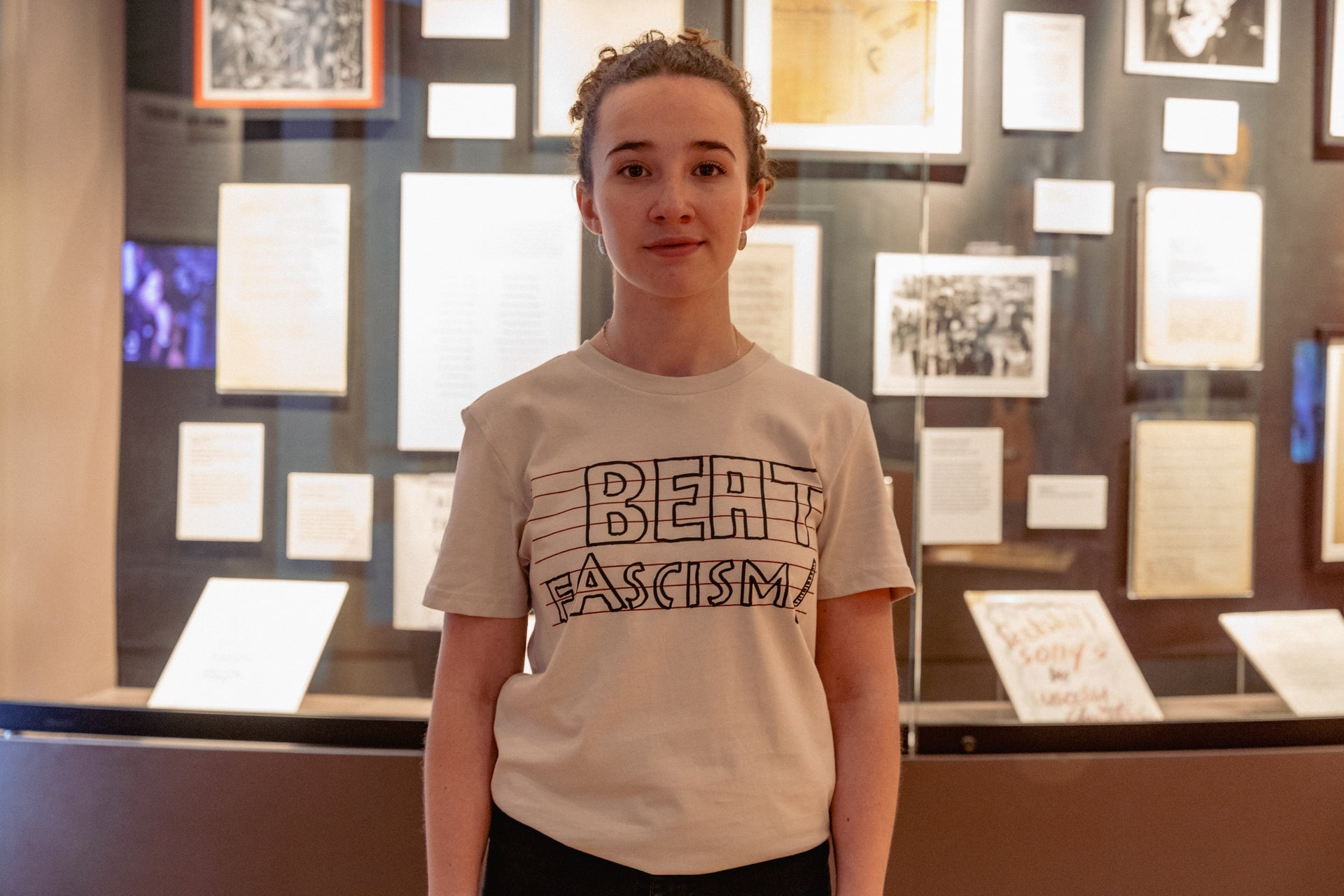 Pulled directly from the Woody Guthrie Center Archives, our Beat Fascism Shirt features an anti-fascist doodle from Woody.