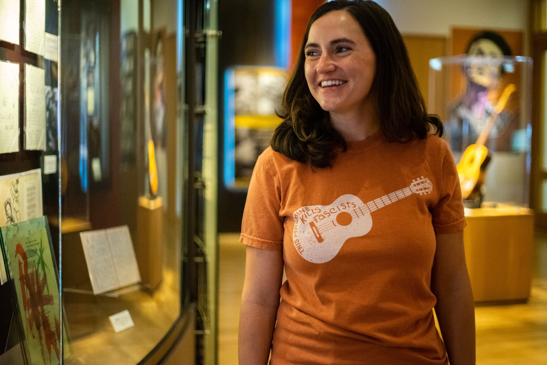 This Machine Kills Fascists! Featuring Woody Guthrie's iconic guitar, this yam-colored, short sleeve shirt is unisex and made from 100% cotton.