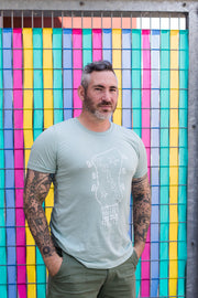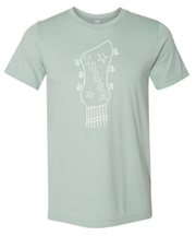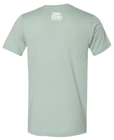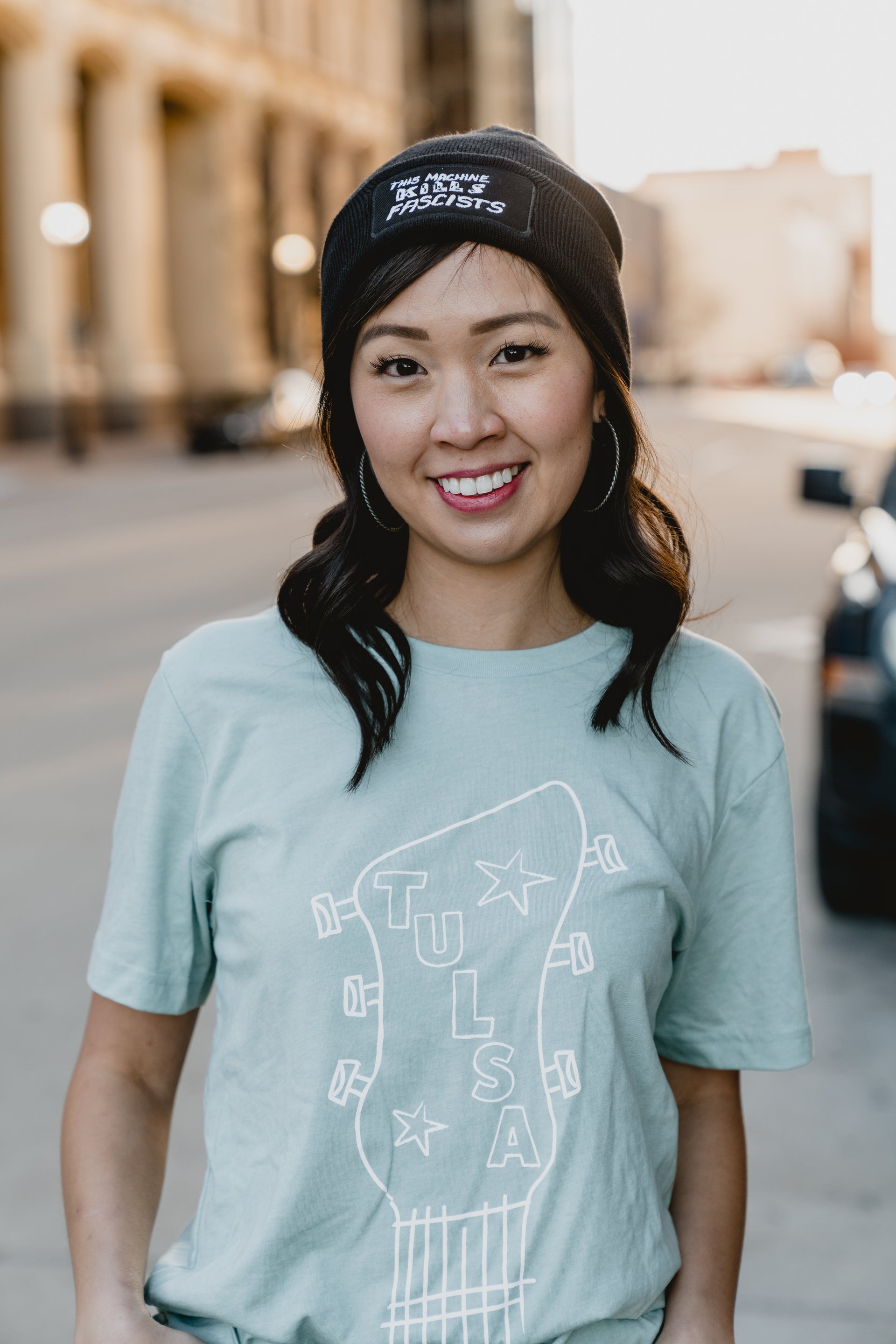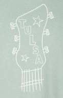 On a super soft dusty blue cotton/polyester blend unisex tee, TULSA is spelled out on the head of a guitar printed in white ink. The Woody Guthrie Center logo is printed on the back, also in white ink.