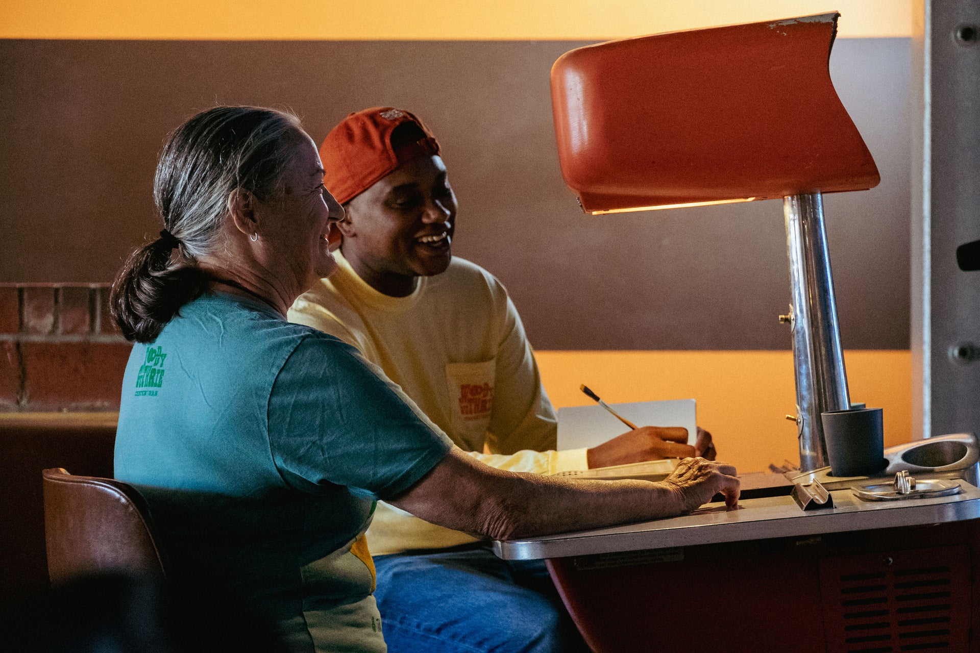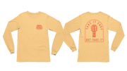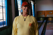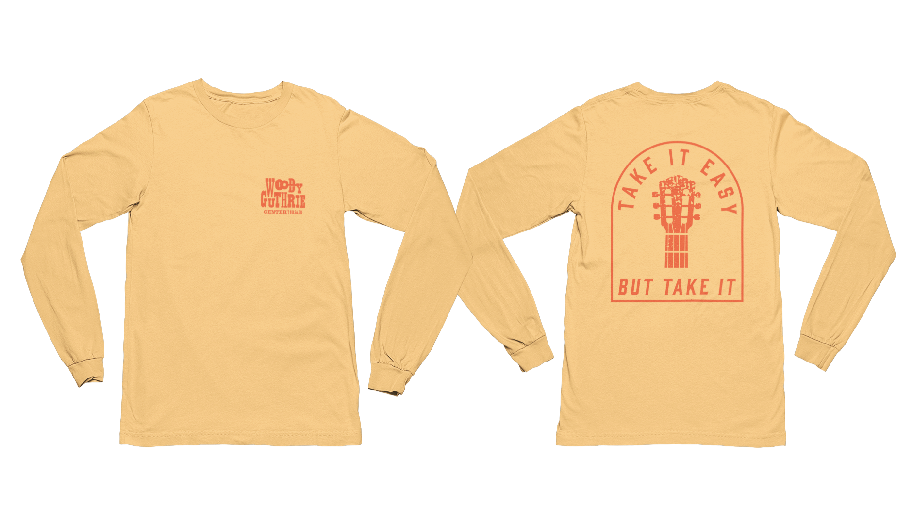 Our new garment-dyed pocket tee features one of Woody's most iconic quotes. Currently available in butter yellow with an orange print. The Woody Guthrie Center logo is printed on the front logo and our Take It Easy design is printed across the back.