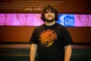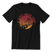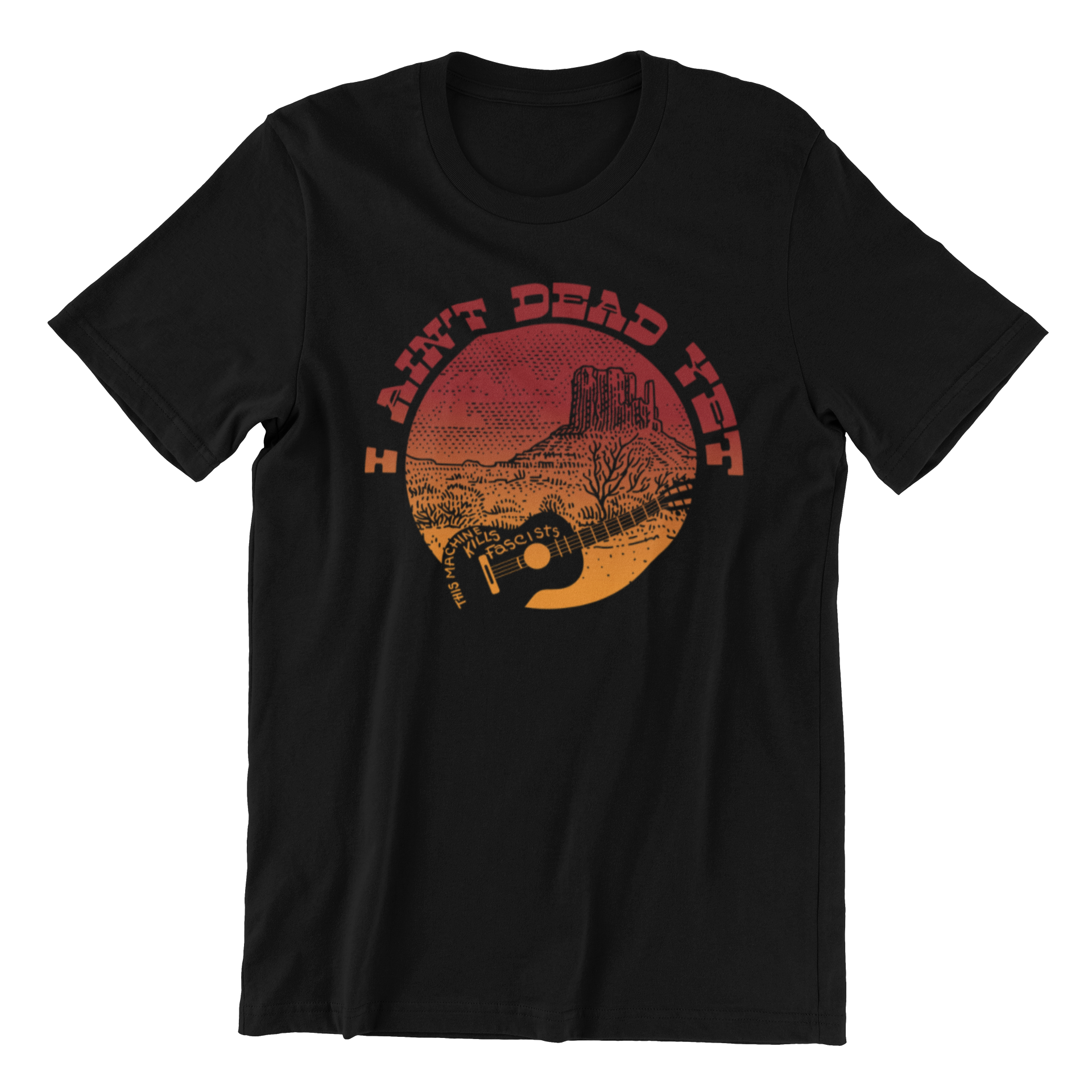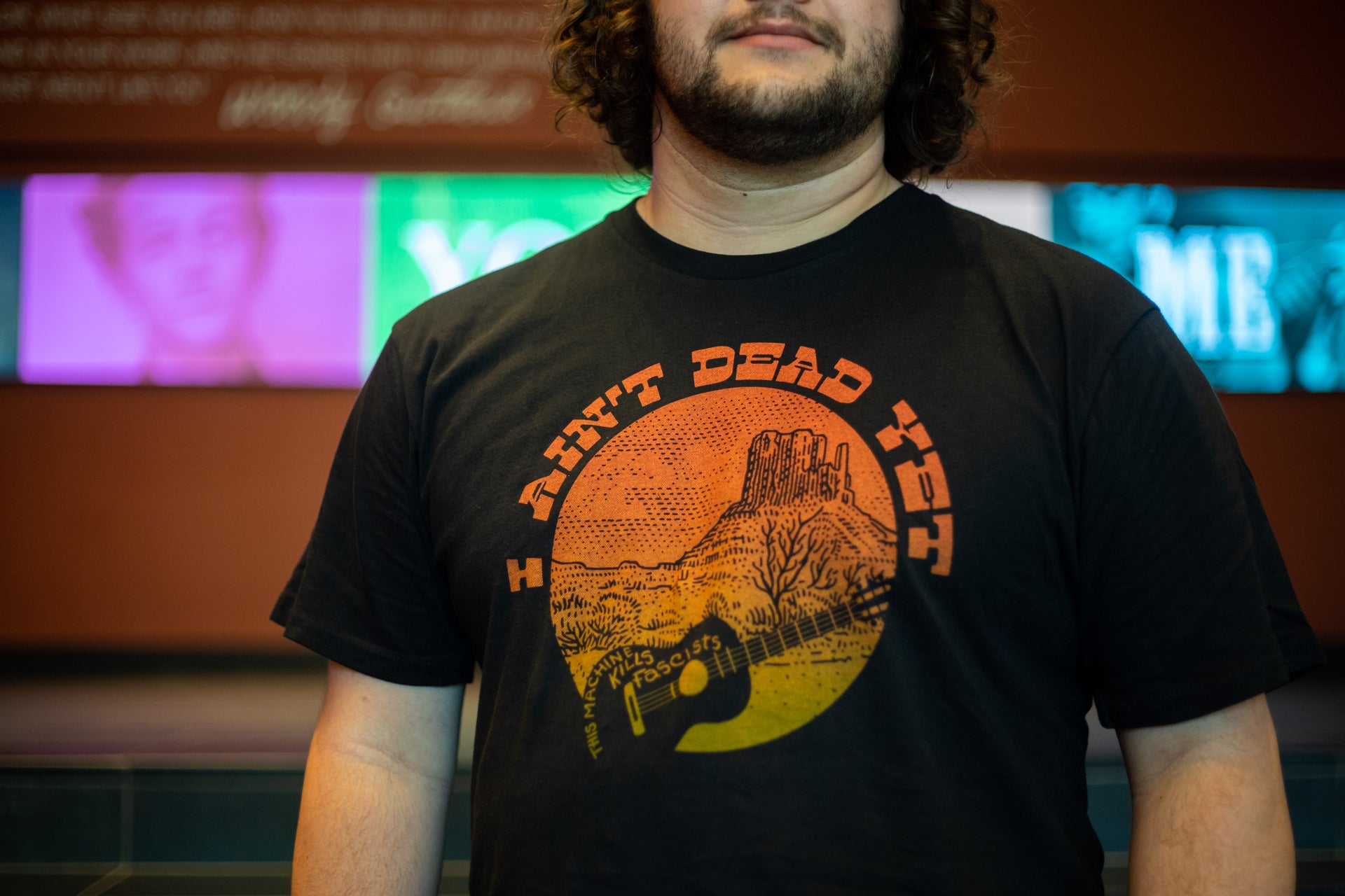 Keep Woody's message of resilience alive in our Ain't Dead Yet tshirt. Currently available in black, this shirt features Woody's This Machine Kills Fascists guitar in a red and yellow gradient.