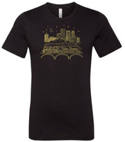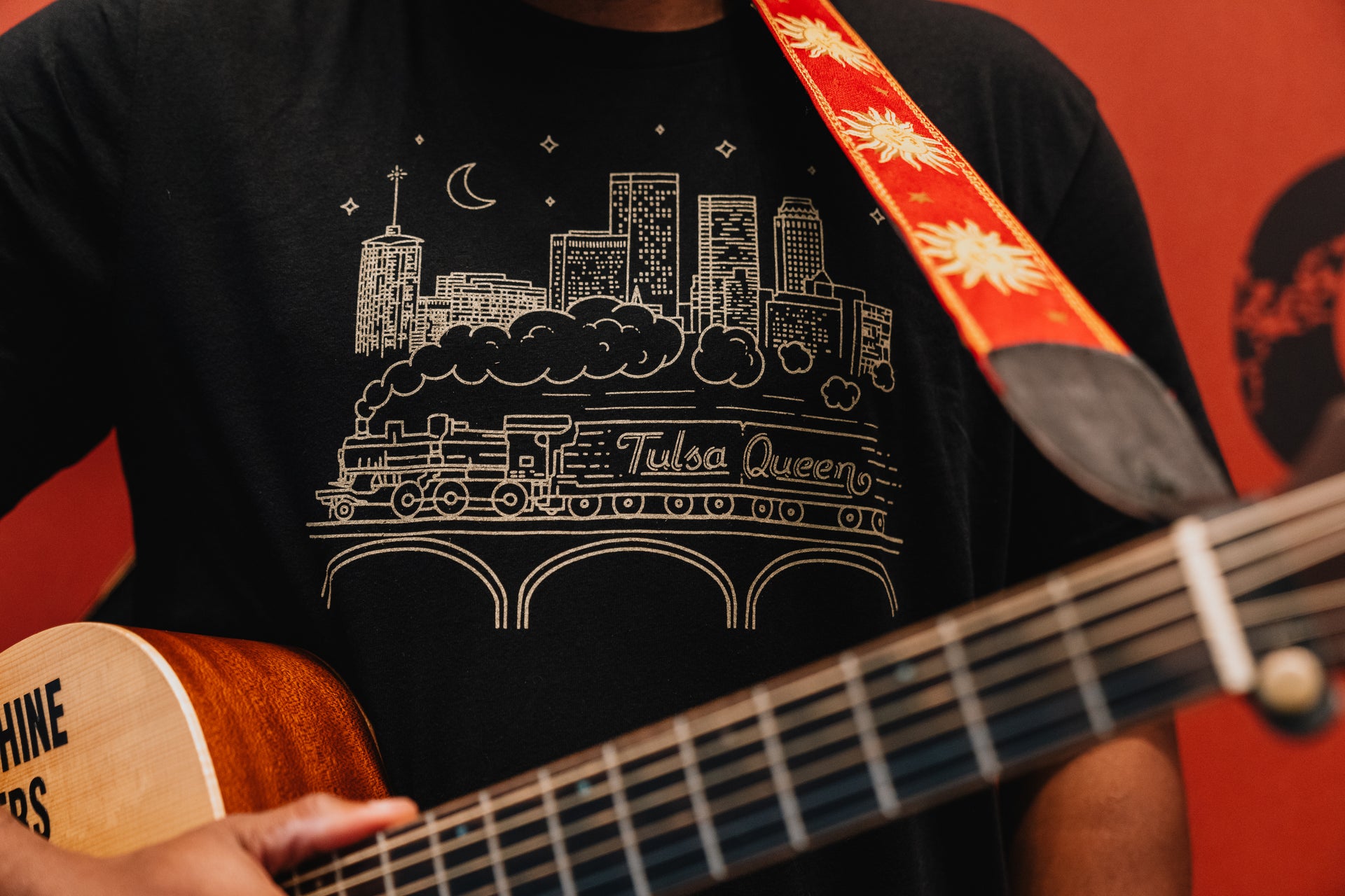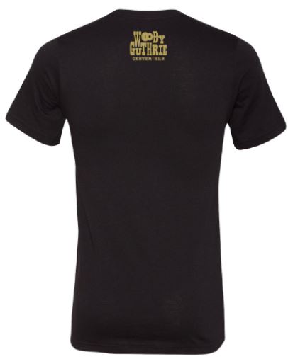 This soft black unisex Bella Canvas shirt depicts the Tulsa Queen train rolling through the moon and star filled night around the downtown skyline and the Woody Guthrie Center logo on the back, all in gold ink.